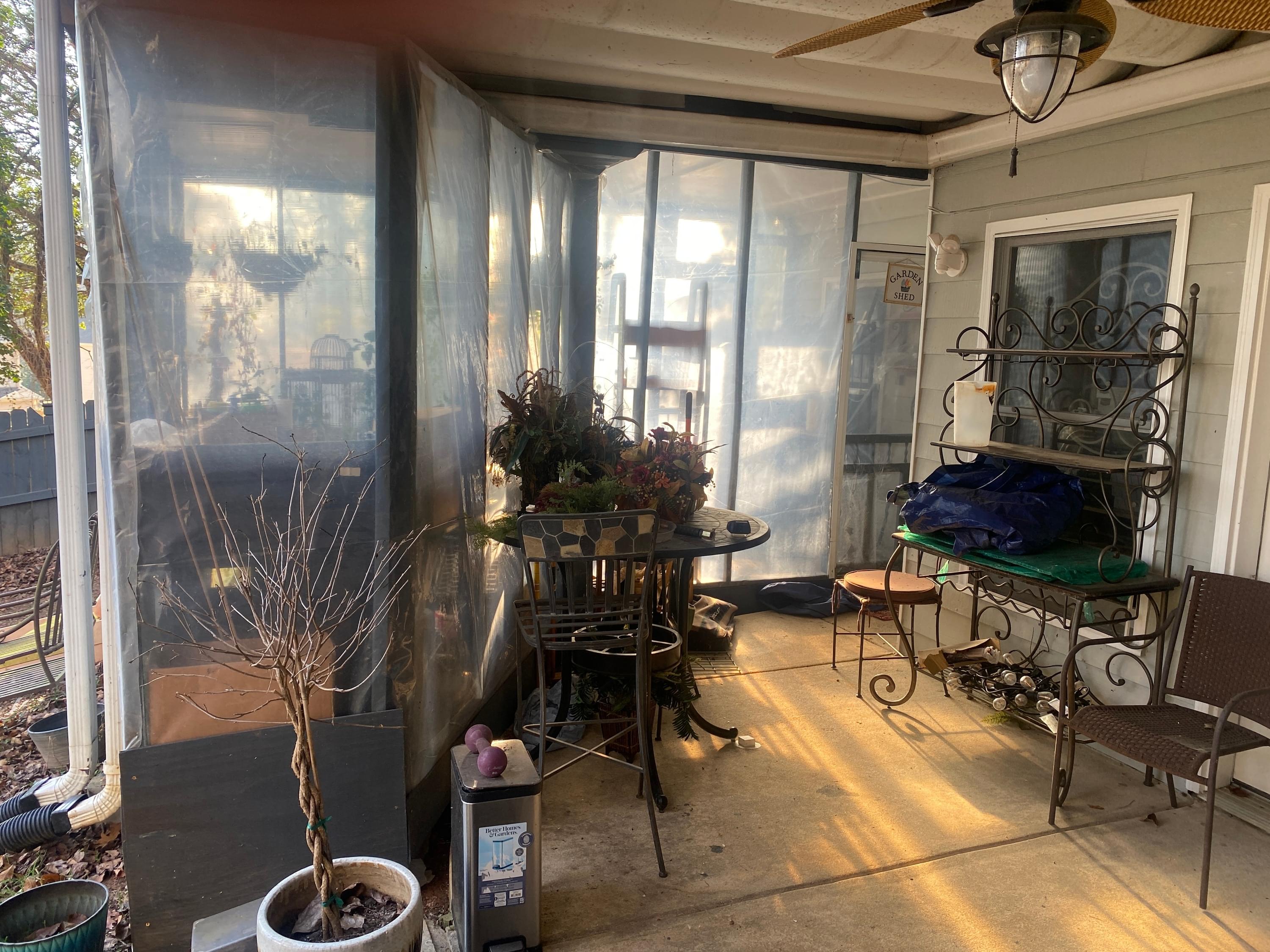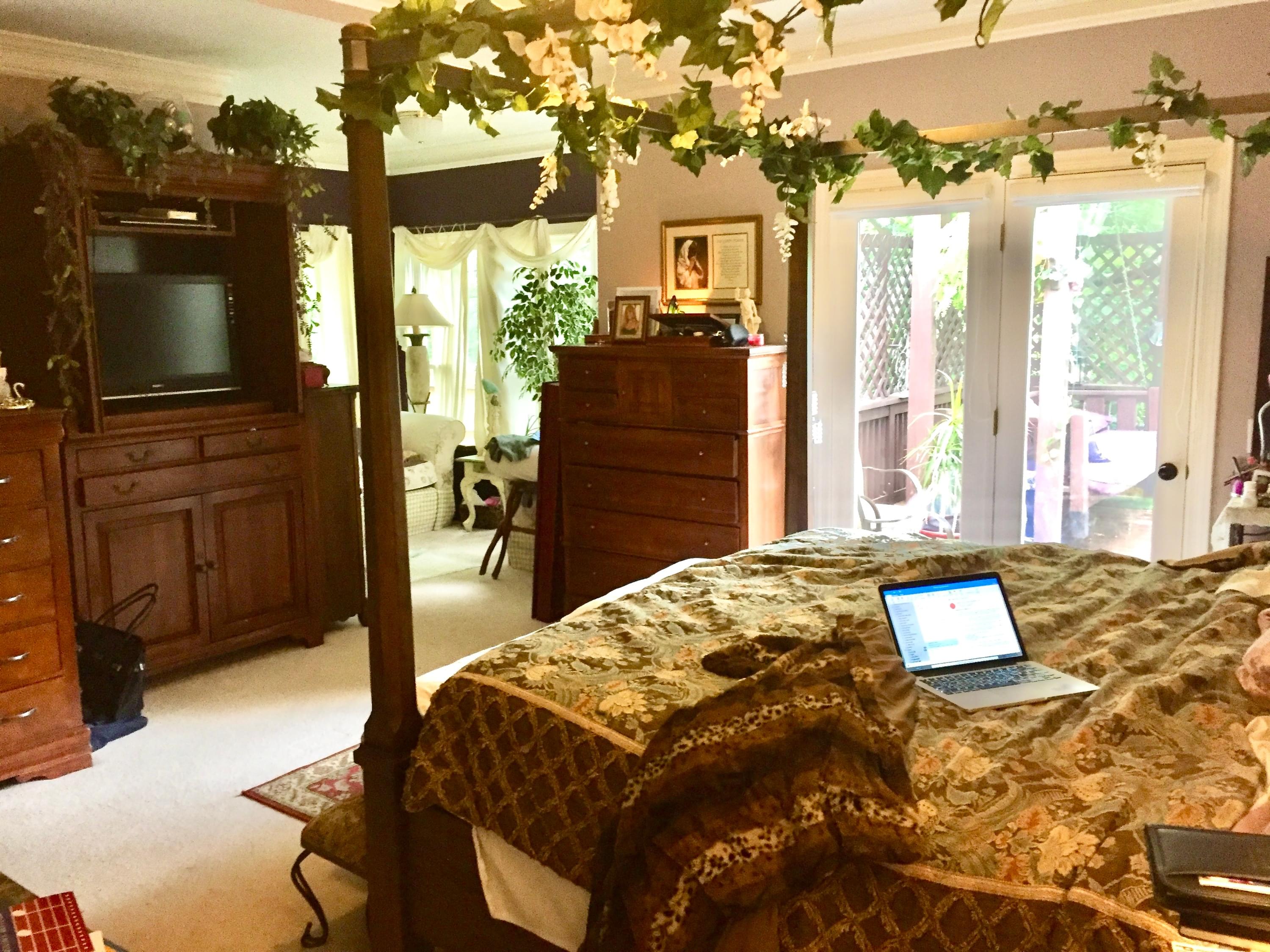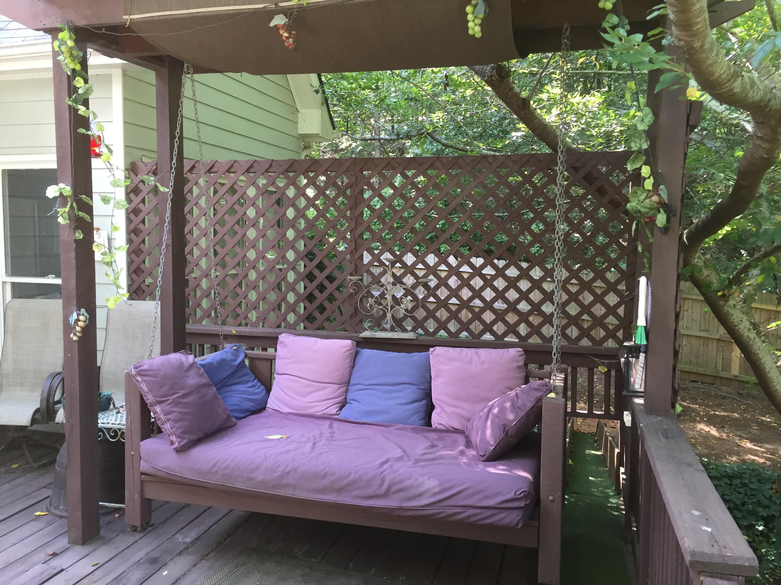 The master bedroom has a sitting area attached to newly redesigned (2025) two vanities, bath, shower and jacuzzi tub. Master features a spacious walk-in closet. Access to the deck and hot tub is through a sliding glass door off the master. A specially custom designed swing awaits you on the deck that was modeled from the actual plans from The Greyfield Inn resort on Cumberland Island. We loved it so much we got the actual plans and built the swing for the expanded deck. The deck has a ramp for our blind dog and a doggie door that is off the sunroom that was built in 2016. The owners live in that sunroom among the trees and open breezes from the 360 degree surround windows.