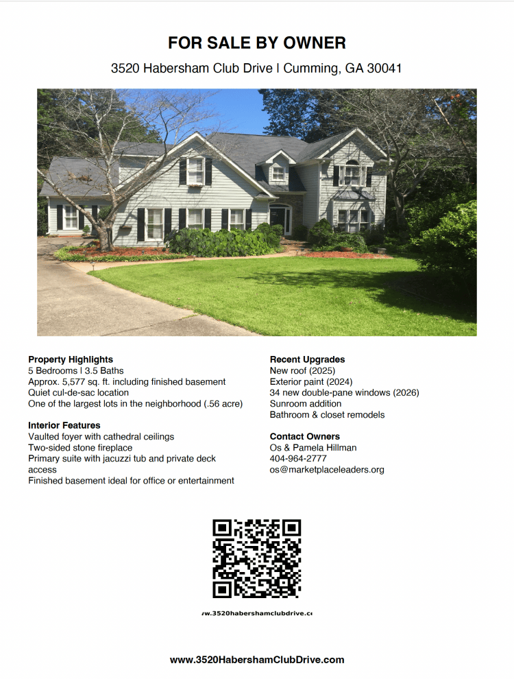 Habersham Subdivision is one of the most established neighborhoods in Forsyth County, just minutes from the shopping district and Lake Lanier. Surrounded by natural beauty this peaceful and private property features a spacious three story traditional home with so much to offer...popular primary on main level and three bedrooms on second floor and one in the basement. Vaulted ceiling entrance welcomes you into a specious living area with vaulted ceiling and huge window. A jacuzzi hot tub is right off the master through a sliding door addition so you can walk right out onto the private deck surrounded by a blooming cherry blossom tree that provides privacy from the surroundings. The home is situated on a .55 acre lot, the largest in the neighborhood, with a vacant lot next door that provides added privacy and option for expanding. The the main living room features a stone two sided fireplace that serves both the living room and kitchen with an attractive mantle stone.